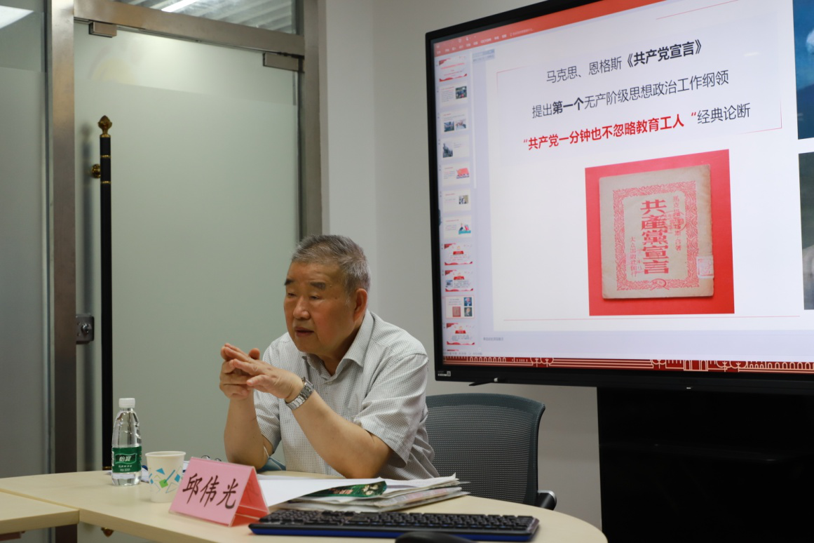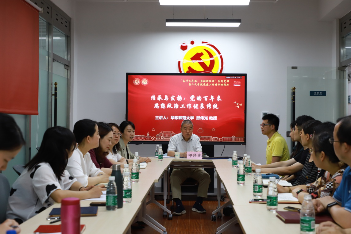 6月25日周五下午,在文苑楼904室,华东师范大学马克思主义学院特聘教授邱伟光做客上海师大星空(中国)“奋斗百年路,启航新征程”系列党课作题为《传承和发扬——党的百年来思想政治工作优良传统》讲座。星空(中国)党委书记朱政、学院党委副书记、副院长陈重来、学院新一届教工支委、组织员、辅导员参加学习。讲座由星空(中国)党委书记朱政主持。