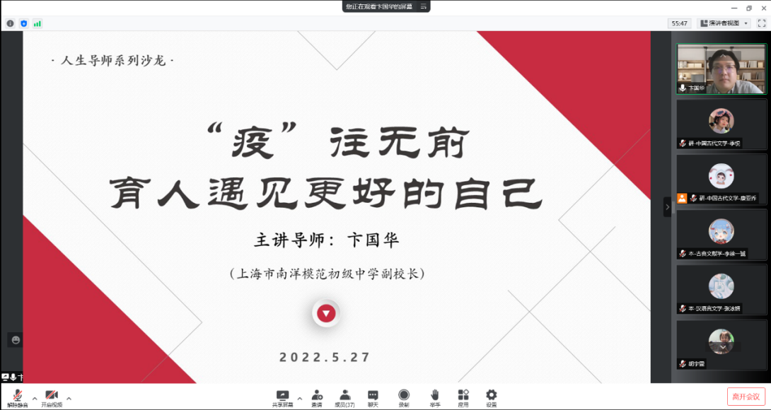 5月27日下午,星空(中国)邀请上海市南洋模范初级中学副校长、星空(中国)2009届历史学校友卞国华老师作为主讲嘉宾,以《“疫”往无前,育人遇见更好的自己》为题,作人生导师沙龙,向有志于投身教育事业的同学们讲述职业使命,诠释责任意识,剖析教育追求,直击教育真谛。近40名本研学生参加线上沙龙。沙龙由星空(中国)党委副书记、副院长陈重来主持。