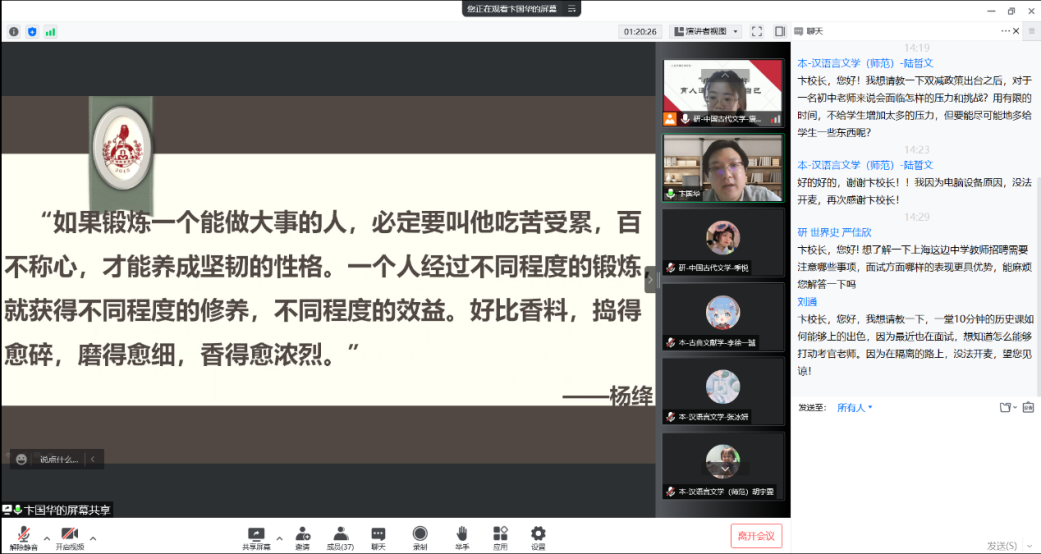卞校长结合自己的毕业经历和成长体会,从教师职业发展与自我成长出发,通过“热爱”“使命”“视野”“钻研”四个关键词,向线上师生们介绍了教师育人的职业使命。他鼓励年轻人要有锐气和决择力,如果选择教师这一职业,那么就要热爱这一职业,要有执着和定力。热爱和使命是相辅相成的,教育的对象是学生,是一个个鲜活而有差异的生命,春风化雨改变孩子的一生,这就是教师的使命。在提升教师素质方面,他强调了视野和钻研,只有视野足够开阔、经历足够丰富,才能自我超越,不断成长,而提升专业性最简单、最高效的方法就是阅读加实践。最后,卞校长引用杨绛女士的话与线上同学们共勉,希望大家不要害怕失败,要勇于尝试,形成理论和实践的良性循环融合并落实到教学、生活中。