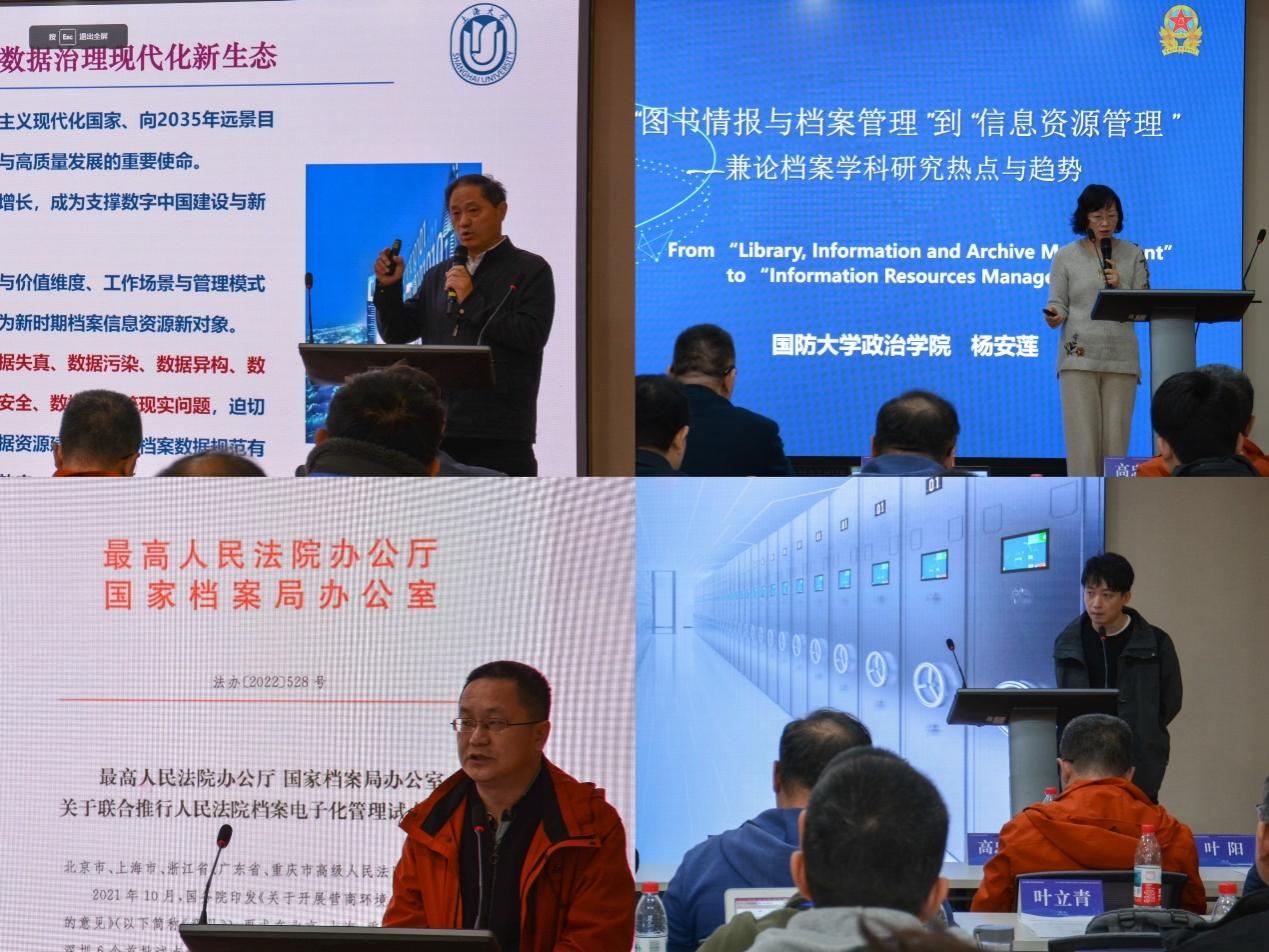 主题报告环节由吕元智教授与上海大学档案学系主任周林兴教授共同主持。上海大学文化遗产与信息管理学院金波教授以“构筑档案数据治理现代化新生态”为题,展望“十五五”期间档案事业发展,提出通过主体协同、流程再造、技术融合等举措,推动跨层级“数据孤岛”向可流通的档案数据要素转化。他强调,应树立数字化、数据化、智能化、智慧化的“四化”理念,推进档案数据治理现代化建设,为新质生产力发展赋能。国防大学政治学院杨安莲教授围绕“从图书情报与档案管理到信息资源管理”展开阐述。她指出,一级学科更名为“信息资源管理”标志着图书、情报、档案等领域从分立走向深度融合,技术迭代不断拓展研究范畴,大数据、人工智能、数据治理等新动能正推动传统学科向“数智化、场景化、资产化”的新生态迈进。上海市高级人民法院档案科科长高忠伟以“上海法院档案单套制转型探索和思考”为题,分享了“单套制”归档在提升档案存储利用效率、服务司法公开与智慧法院建设方面的实践成效,并分析了数据安全与系统适配等潜在挑战。上海涵妍档案信息技术有限责任公司首席架构师叶立青围绕“数智赋能:人工智能在档案管理中的创新路径与实践”,探讨了AI模型与知识图谱融合推动档案管理全流程智能化升级的路径。