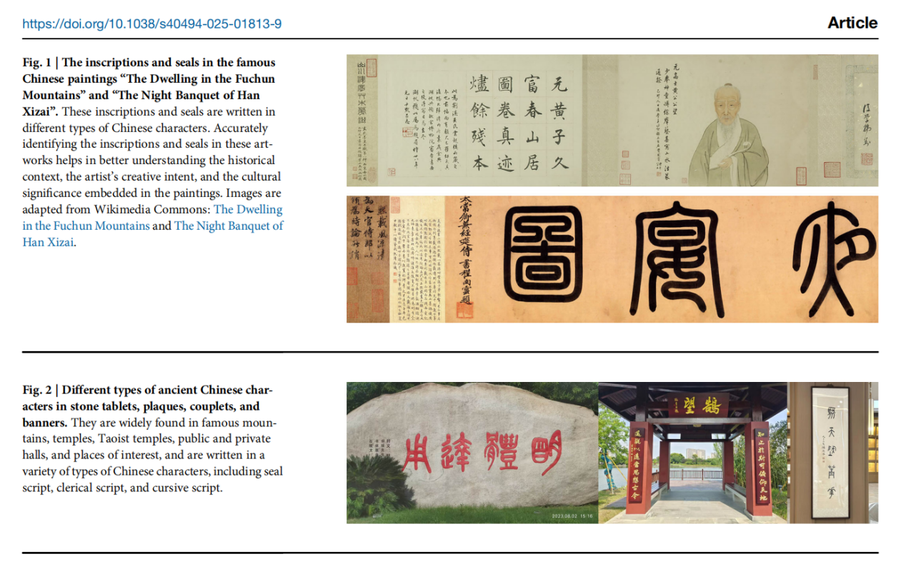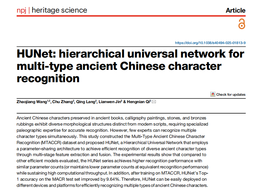 2025年6月19日,Nature子刊npjheritagescience在线发表星空网页版登录入口星空(中国)数字人文专业博士生王钊江(指导教师吴夏平教授)与湖州师范学院、华南理工大学联合开展的一项针对多样化应用场景古汉字识别的重要成果,题为“HUNet: hierarchicaluniversalnetworkformulti-typeancientChinesecharacterrecognition”(https://www.nature.com/articles/s40494-025-01813-9)。论文提出了一种面向中国八体汉字识别的轻量化网络模型。该模型针对书法挂画、碑刻石刻、楹联匾额等多样化应用场景,实现了对古代汉字的精准高效识别。通过创新的网络架构设计,模型在保证识别准确率的同时显著降低了计算复杂度,具备良好的跨平台适配性,可灵活部署于各类终端设备。