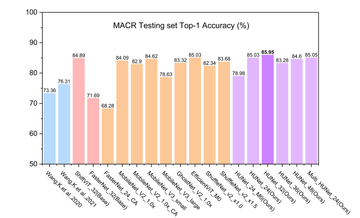 实验结果表明,HUNet模型在MTACCR数据集和多场景古汉字识别(MACR) 数据集上的测试性能表现优异。与其他参与评估的高效CNNs和ViTs模型相比,HUNet在参数量相当的情况下实现了更高的识别性能,或在识别性能相当的情况下保持了更低的参数量,同时维持了较高的计算吞吐量。在 MTACCRTest_1测试集上(包含60万测试样本),HUNet_48的Top-1准确率达到 94.23%。在MACR测试集上,使用MTACCR训练的HUNet模型的Top-1准确率提升了 9.64%。此外,HUNet还可有效扩展到非汉字古代文本识别任务,在DeepLontar和ALPUB_v2两个数据集上表现出一定的竞争优势。