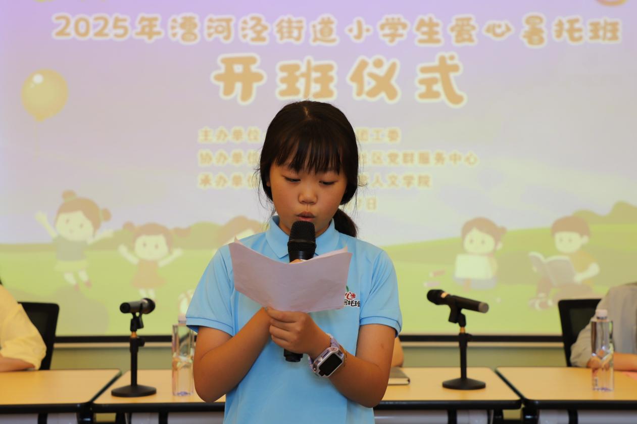 班主任代表邵敏怡表示自己已经是第四次来暑托班担任志愿者,并分享了她将理论知识转化为社会实践的收获与感动,表达了在2025年爱心暑托班中倾情奉献、“寓教于乐”,继续为孩子们创造有意义学习体验的承诺。