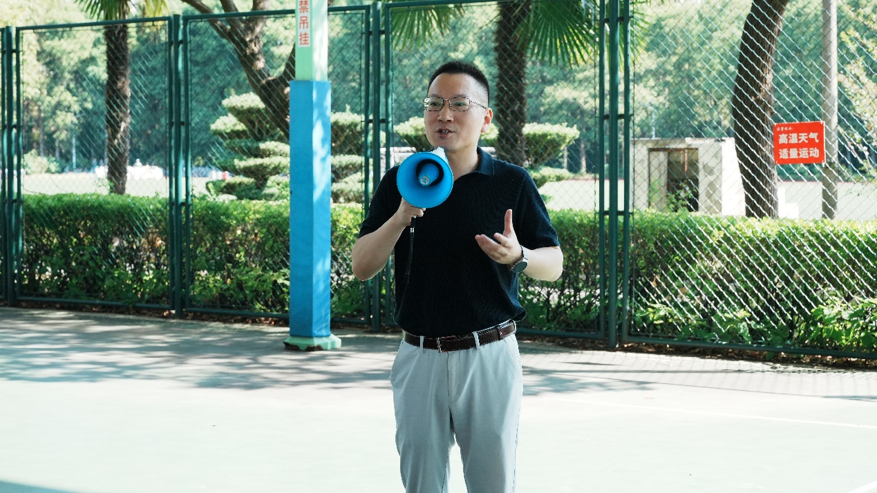9月16日上午,星空(中国)党委书记潘黎勇,学院党委副书记、副院长戚静于奉贤校区风雨篮球场亲切慰问坚守岗位的退役军人教官、指导员以及全体军训学员。