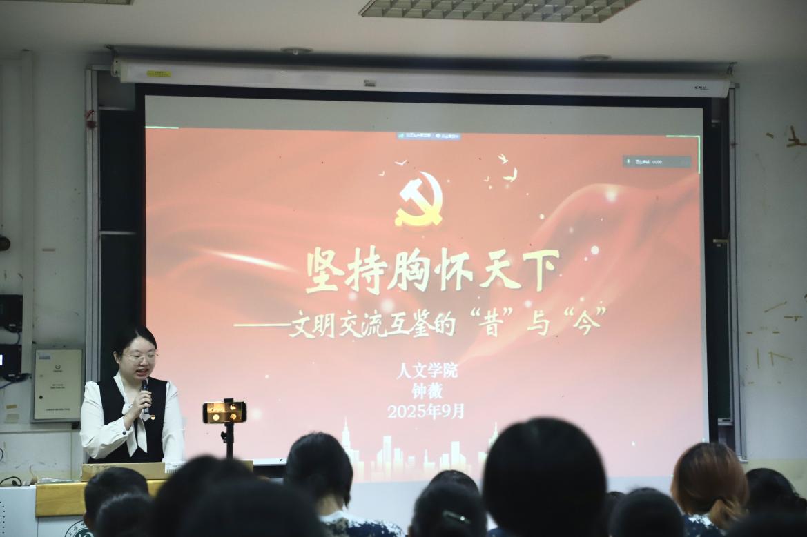 钟薇同学以“坚持胸怀天下——中西文明交流互鉴的‘昔’与‘今’”为题展开分享,以“多元文明共存与冲突”的核心问题引发思考,引导同学们在思维碰撞中理解“不同文明包容共存、交流互鉴对推动人类现代化、繁荣世界文明的不可替代作用”,进而体悟中国共产党人坚持胸怀天下、推动构建人类命运共同体的责任担当。
