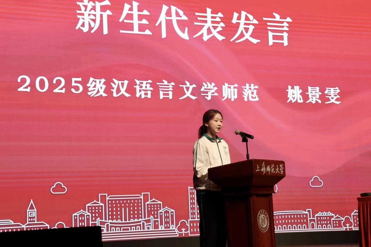 2025级汉语言文学(师范)专业的姚景雯作为新生代表发言。她深情讲述了与师大结缘的故事,并分享了她对“汉语言文学(师范)”专业的深刻理解与敬畏之心。她表示,将和全体新同学一起,尽快适应大学生活,夯实专业本领,积极投身实践,秉承师大精神,在人文沃土上书写无愧于时代的青春华章。