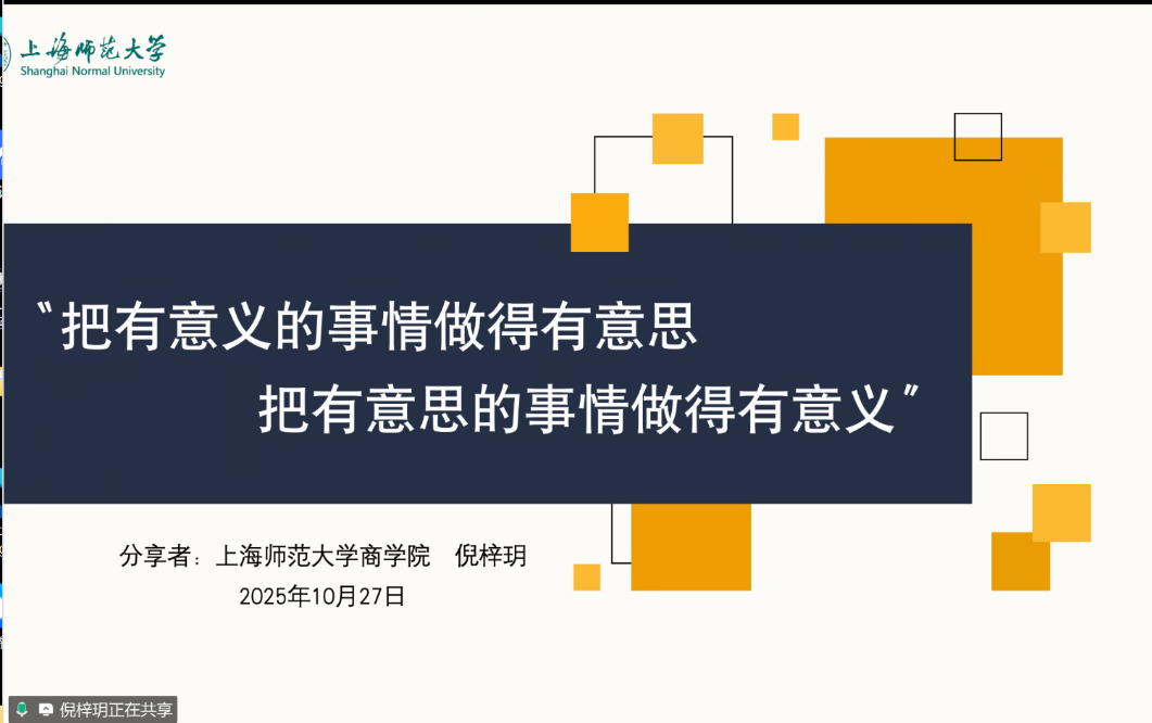10月27日20:30-21:30,2025级商学院研究生、校第二十三届学生会主席团成员倪梓玥以“从‘纸上谈兵’到‘沙场点兵’:如何赋能活动实战”为主题,分享活动策划的实战经验。她结合自身经历,围绕活动落实的关键环节展开详细介绍,为大家提供了清晰的行动指南。