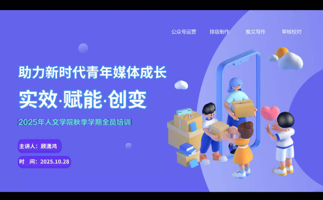 10月29日20:30-21:30,2025级学科教学(语文)专业研究生、校第二十四届学生会主席团成员顾潇鸿围绕“实效·赋能·创变——助力新时代青年媒体成长”的主题,分享了她关于新媒体运营的实用技巧,为大家打造有影响力的青年媒体内容提供了方法指引。