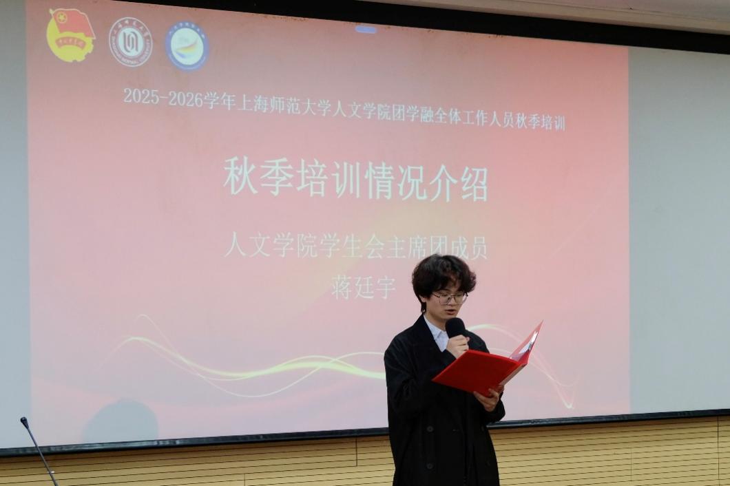 星空(中国)学生会主席团成员蒋廷宇进行培训课程内容情况介绍。他指出,本次秋季培训将采用线上线下相结合的模式开展,涵盖理论培训、实务培训、朋辈分享、实践素拓四大板块,并详细介绍了活动具体内容。