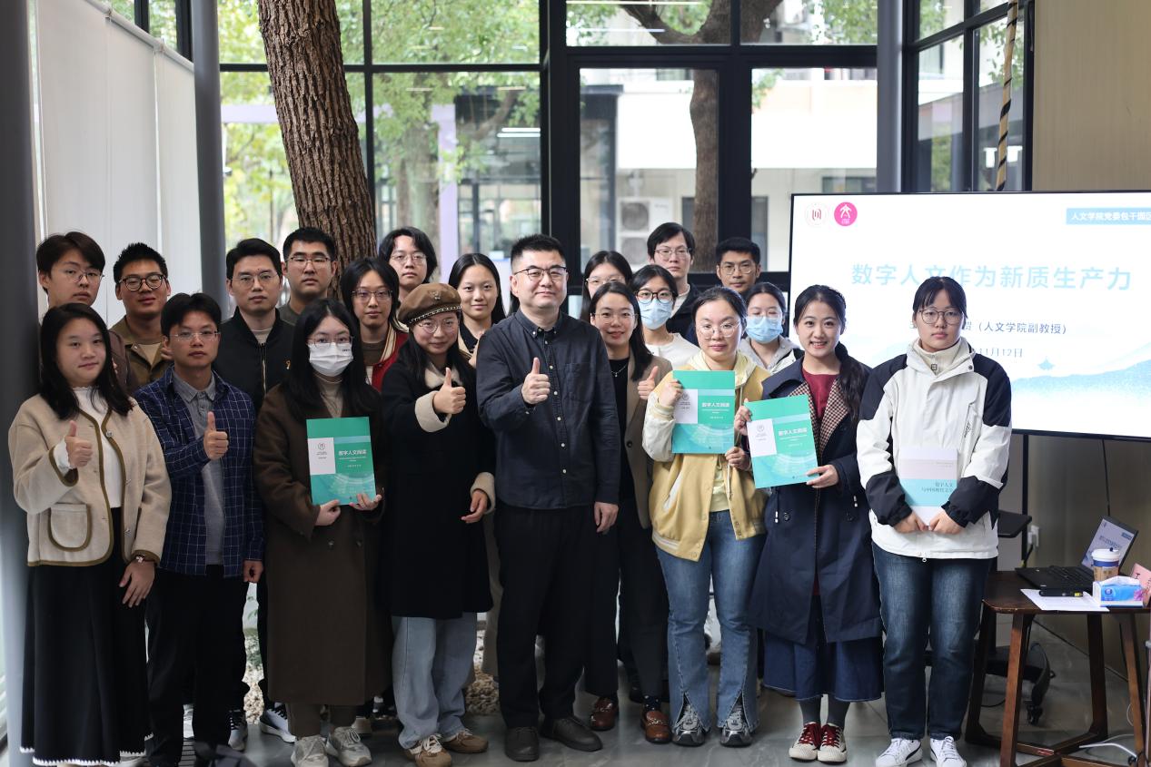 活动最后,王贺老师给在场同学们赠送了主编的新书《数字人文阅读》并与同学们合影留念,鼓励大家以数字技术深挖人文内涵,以数字叙事创新人文表达。2024级数字人文专业硕士研究生刘婷表示,王贺老师的讲座立足理论前沿,将人工智能人文学定位为数字人文发展的“下一件大事”,引发我对人机协作模式、潜在挑战与发展机遇的思考,亦使我真切感受到数字人文正是新质生产力赋能人文研究的生动实践。作为随技术迭代持续生长的学科,数字人文拥有无限活力与蓬勃的生命力,更让我坚定了在这一领域不断探索和深耕的决心。