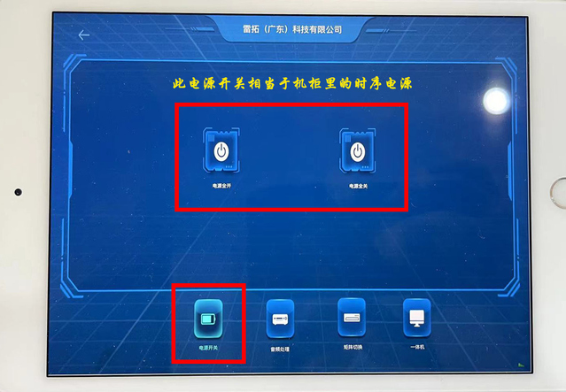 2、先点iPad底部的第一个图标切换到“电源开关”选项卡。此处的电源开关可以远程操控机柜中所有设备的全部开启或全部关闭。(此功能等同于机柜中的时序电源)