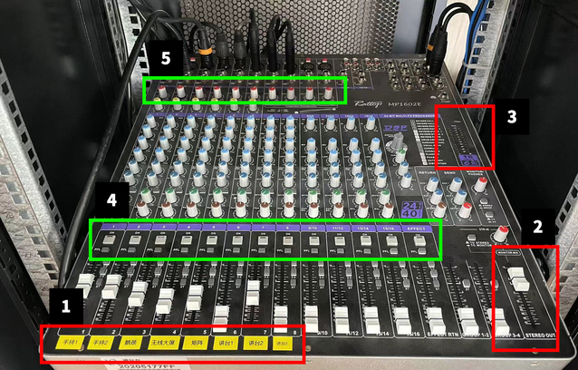 区域1为音频输入,接通的线路都贴上了名字,用推子控制音量增减。(注意,这里的无线大屏指的是笔记本单独投大屏时的音量输出。而讲台1-3指的是讲台话筒,大屏幕以及讲台电脑的音频都是走的矩阵线路。)