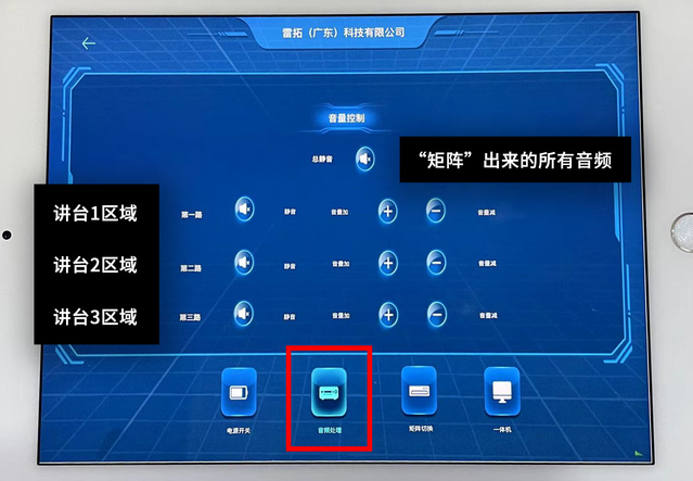 3、“音频处理”选项卡控制所有从矩阵输出的声音,包括大屏的外放、讲台的话筒和外放、鹅颈和手持话筒等,所以误按“总静音”可能导致会场无法输出任何声音,请谨慎使用。三条线路分别控制左中右三块区域的声音,可以用来快速让某个区域静音。不过一般来说,我们建议这里保持原始设置,所有声音都在调音台上处理,后文会详述。